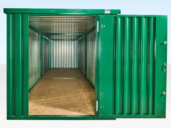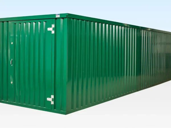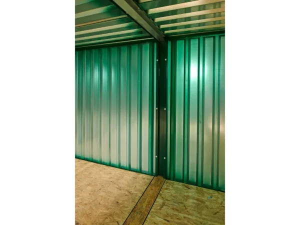 La conexión de contenedores de almacenamiento planos es una forma rápida y sencilla de crear espacio para almacenar material de gran longitud. Dos contenedores conectados de 4 metros de largo y con recubrimiento de polvo verde dan como resultado una longitud interna de 7,56 metros.